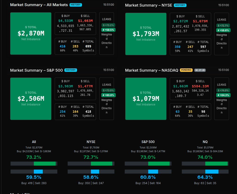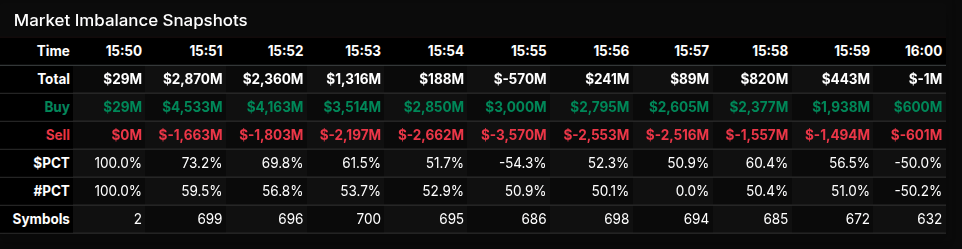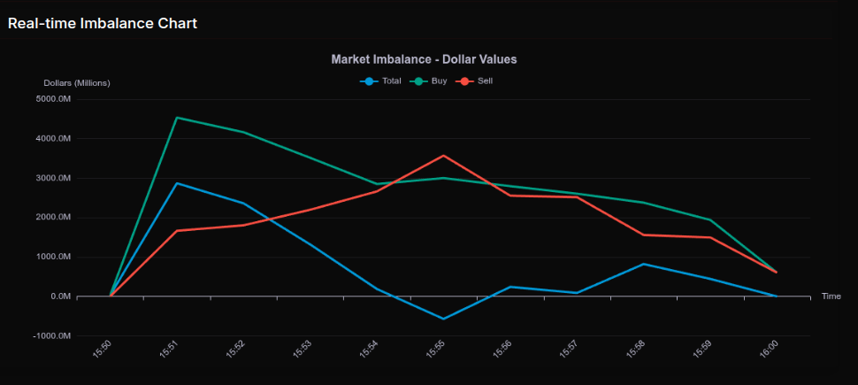 The Market-on-Close auction opened with a decisive buy-side tone that quickly established control across the tape, particularly once the clock rolled past 15:51. Early prints showed a sharp expansion in buy dollars, peaking near $4.5B against $1.6B in sell interest, producing a net imbalance of roughly $2.9B. While total imbalance fluctuated through the final ten minutes, the underlying story was persistent demand rather than a one-off spike, with buyers repeatedly reasserting control after brief pauses.