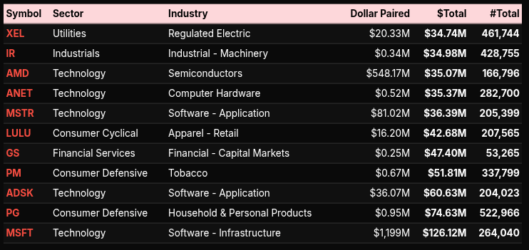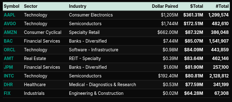 At the symbol level, mega-cap technology dominated the auction. AAPL, MSFT, AVGO, and ORCL absorbed substantial dollar flows, with AAPL alone accounting for over $360M in paired dollars. Financials such as BAC and JPM reinforced the sector-level signal, while selective industrial and healthcare names rounded out the buy list. Notably, many of these symbols exhibited leans well above 66%, underscoring institutional-style buying rather than rotational churn.