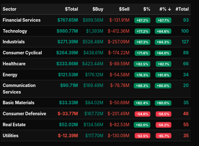 From a sector perspective, the flow was clearly growth- and risk-oriented. Technology led both in dollars and participation, posting nearly $981M in total imbalance with buy-side dominance above 77%, a level consistent with wholesale accumulation rather than simple rotation. Financial Services followed closely, with an 87% buy skew and strong symbol breadth, signaling institutional allocation rather than narrow stock-specific demand. Industrials and Consumer Cyclical also showed buy leans north of 67%, reinforcing the idea of broad-based risk engagement rather than defensive positioning.