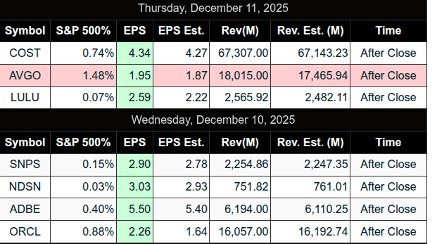 After the close, Oracle’s Q2 fiscal 2026 earnings disappointed investors due to a small revenue miss: $16.1B vs. $16.2B. The miss was driven by declining traditional software sales and negative free cash flow for AI infrastructure, which fueled concerns over rising debt and delayed returns on heavy spending. Shares plunged 11%.