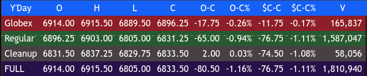 From there, it sold off down to 6825.50 at 2:25, traded up to 6839.00 at 3:10, sold off again down to 6814.50 at 3:35, traded up to 6832.50 at 3:45, and was at 6827.50 as the 3:50 cash imbalance showed $3.1 billion to buy. It then traded up to 6837.25 and flatlined into the 5:00 futures close, settling at 6830.75 — down 76.50 points or 1.11%, the largest drop since November 12, 2025.