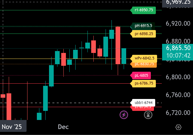 Overall, bias remains balanced-to-bullish above 6842.50. A clean break and hold below that level would shift focus toward the lower range targets, while strength above 6898.25 keeps upside continuation in play.