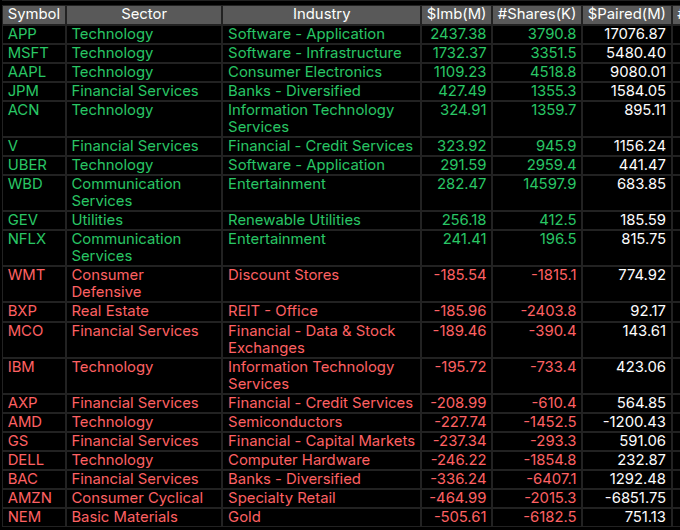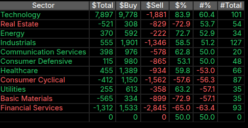 On the OPEX Market-on-Close imbalance data, notables appeared late in the day. The total imbalance printed $7.2 billion to buy at 15:51, with dollar flow leaning 61.4% to the buy side, although the symbol imbalance stood at -51.4%, showing more individual stocks leaning sell. Sector breakdown revealed strength in Technology, with $7.9 billion in net buy imbalances, led by APP, MSFT, and AAPL. On the other side, Financials showed notable sell pressure, with over $1.3 billion net to sell, alongside weakness in Consumer Cyclicals and Basic Materials.