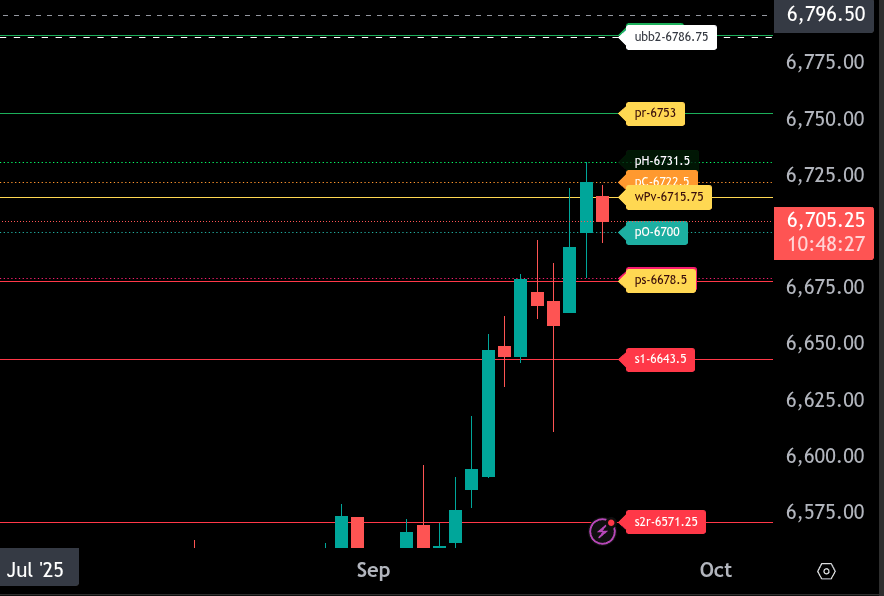 On the upside, reclaiming and holding above 6715.75 would shift momentum back to the bulls, with immediate resistance at 6731.50 and the upper range target at 6753. Next up is 6786.75, which would be the stretch objective if buyers sustain control.