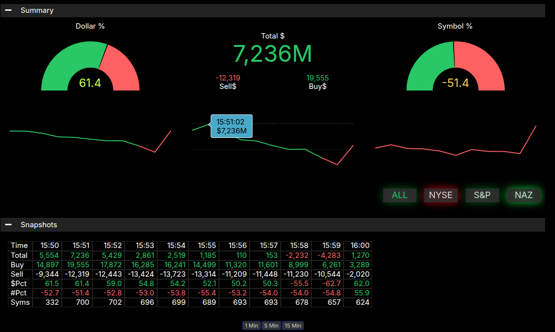 The imbalance supported the late afternoon rally, helping the ES hold gains into the close. Despite some mixed readings across sectors, broad tech strength provided the underlying bid that kept the index positive. The final outcome was a solidly bullish day, with ES closing near its highs and marking a 0.44% gain from the prior day’s settlement. Looking ahead, the strong finish and supportive MOC flows suggest continued upside potential if buyers can defend support levels on early pullbacks.