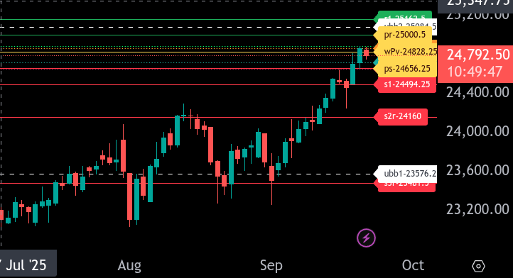 The intraday tone remains bearish while under 24,828.25. Bulls need to reclaim and hold above this pivot to shift momentum back toward the upside targets.