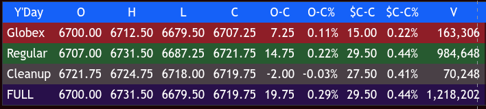 The cleanup session saw limited movement, opening at 6721.75 and easing down to 6718.00 before finishing at 6719.75, down 2.00 points on the session. Taken together, the full session advanced 19.75 points, a 0.29% gain on the day. Total volume reached 1.218 million contracts, with 984k traded during the regular session.