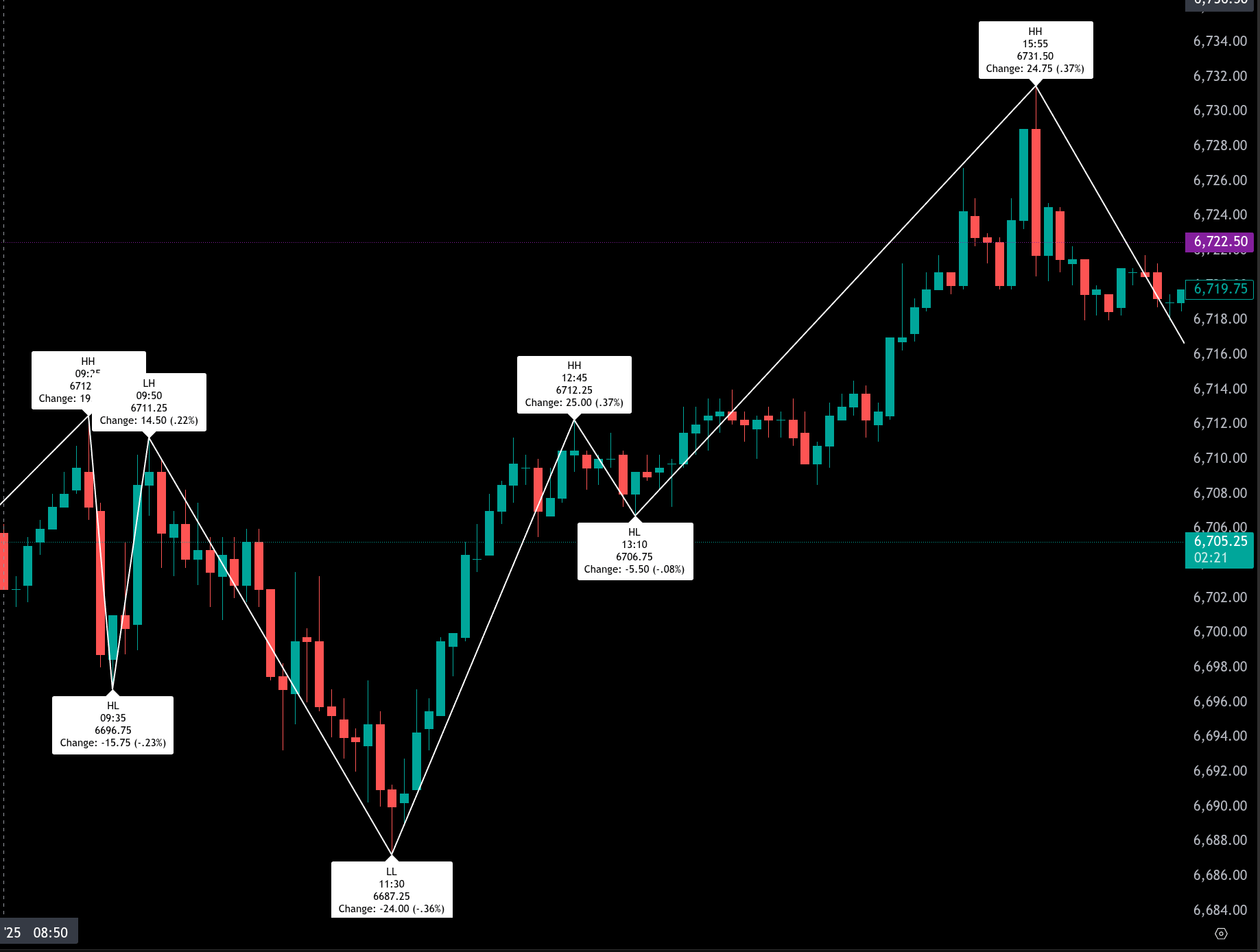 The regular session began at 6707.00 and pulled back to 6696.25 at 09:35. A brief recovery to 6711.25 at 09:50 set up the morning’s lower high, which gave way to a drop to 6687.25 by 11:30. Buyers reemerged mid-morning, pushing ES back up to 6712.25 at 12:45. After a shallow pullback to 6706.75 at 13:10, the rally continued into the afternoon, with a new high of 6731.50 recorded at 15:55. The session settled at 6721.75, up 14.75 points from the open and 29.50 points, or 0.44%, above the previous close.
