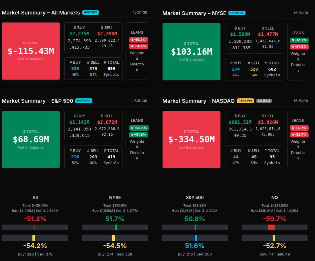 At 15:51, the S&P 500’s subset showed a modest +$68.7M net buy, with NYSE running +$103M to buy, offset by NASDAQ’s -$334M sell. The weighted leans — NYSE +51.7% versus NASDAQ -59.7% — encapsulated a clear large-cap tech unwind offset by traditional sector accumulation.