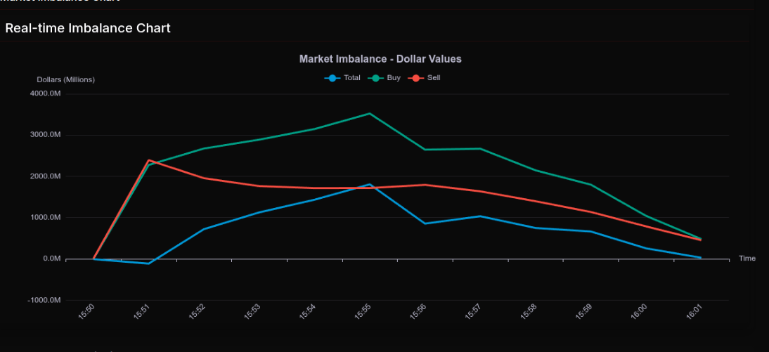 The market-on-close (MOC) imbalance opened with mixed signals across sectors but transitioned into a firm rotation rather than a broad directional move. Early readings showed total sell pressure of roughly $2.39 billion against $2.27 billion in buys, a net imbalance of about $115 million to sell, which quickly narrowed and flipped positive before tapering into the close. The 15:55 peak saw $3.52B in buys versus $1.71B sells — a strong intraday buy surge that eased into $479M by 16:01.