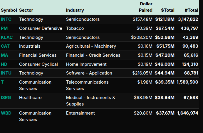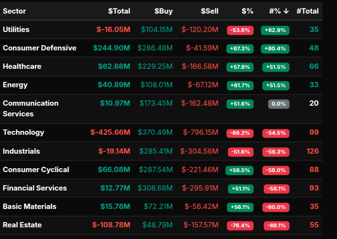 On the symbol level, NVDA (+$265M), AAPL (+$68.9M), and PLTR (+$113.7M) dominated Technology flows despite the sector’s aggregate sell lean, showing internal rotation between software and semiconductors. AMZN (+$35M) and HD (+$46M) represented consumer participation, while JPM (+$46M) and V (+$43M) stood out in Financials. The heaviest negative lean came from Technology (-68%), indicating wholesale distribution, while sectors near ±50% such as Communication Services (+51.6%) and Industrials (-51.6%), reflected more balanced rotation.