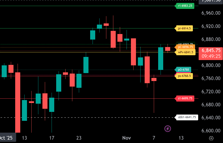 Intraday bias remains neutral to slightly bullish above 6841.50, but a close below that level could open the door for a retest of lower support levels.