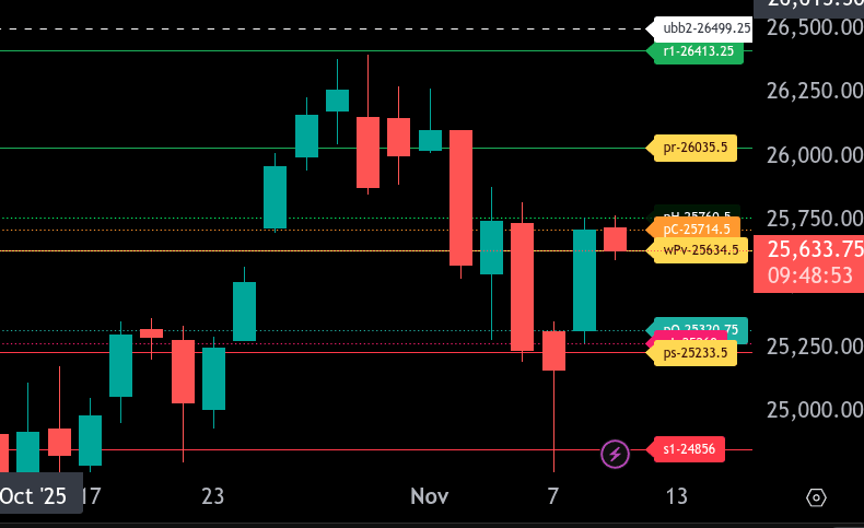 Overall, below 25,634.50, sellers maintain control. A sustained move above this line would favor buyers for a possible test of 26,000+. Stay mindful of early volatility as the market digests overnight movement.