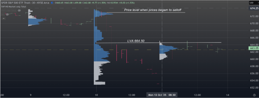 Price action with the SPY can be interpreted as a balance day. A strong bounce after Friday’s selloff. Friday had multiple distributions the LVA (664.50 area) seemed to hold today’s action. That level will act as a key to being either bullish or bearish going forward. If prices cannot trade above expect prices to possible test the lows from Friday.