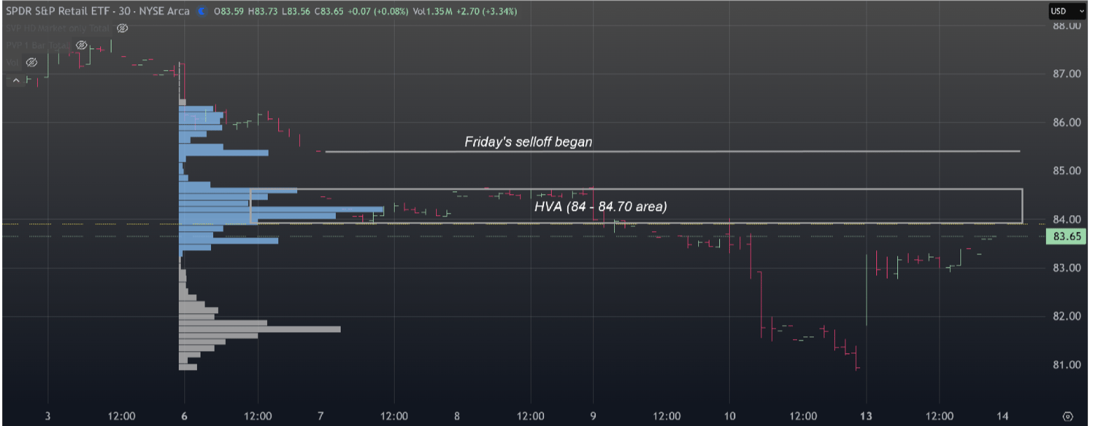 Omitting the gold and gold miners the only sector, surprisingly, that seemed to relatively outperform was the Retail Sector (XRT) It basically closed at the level prior to Friday’s selloff. Prices being accepted above the 84.70 area should start bullish swing move.