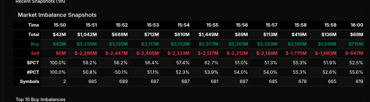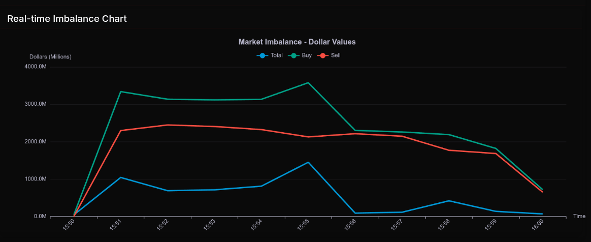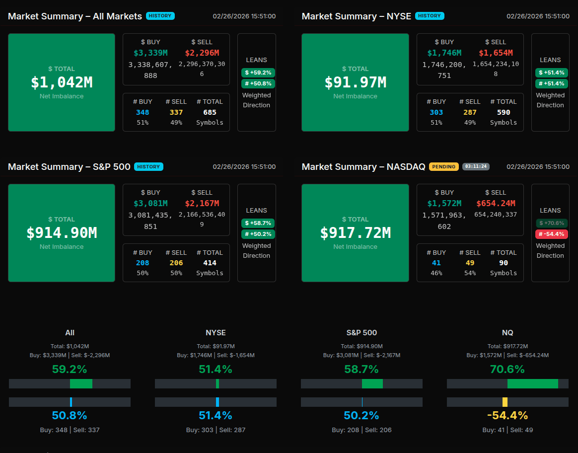 The February 26th MOC session opened with a clear institutional bid and built steadily into the 3:55 pm imbalance peak before tapering into the close. At 3:50 pm, the market showed a modest $42M buy imbalance, but by 3:51 pm, buy programs accelerated sharply to over $3.3B versus $2.29B for sale, producing a $1.04B net buy. The imbalance remained consistently bid dominant through 3:55 pm, where total buy pressure peaked near $3.57B, reflecting broad participation with nearly 685 symbols active. From 3:56 pm onward, both buy and sell programs compressed, finishing with a still-positive $68M buy skew into 4:00 pm.