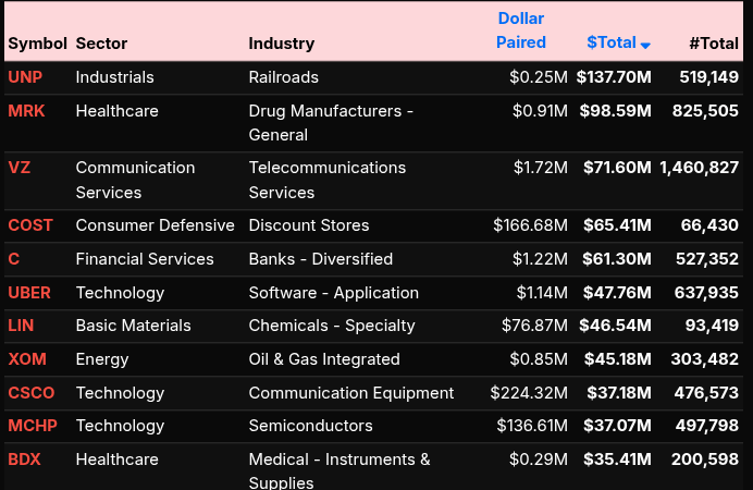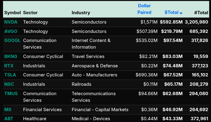 Top buy imbalances were led by NVDA ($592.85M), AVGO ($219.79M), and GOOGL ($97.54M), reinforcing concentrated Nasdaq strength. On the sell side, UNP, MRK, VZ, and COST highlighted sector-specific distribution pockets.