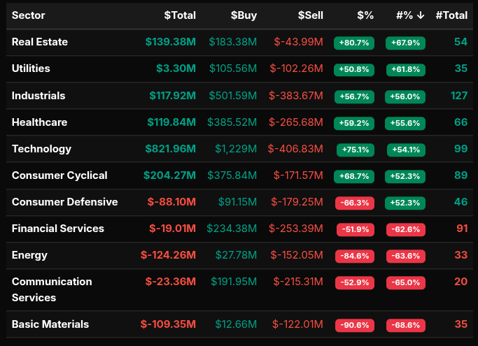 Technology dominated flows with a $821.96M net buy and a +75.1% dollar lean — notably above the 66% threshold, signaling institutional-style accumulation. Industrials (+56.7%), Healthcare (+59.2%), and Consumer Cyclical (+68.7%) also saw strong bids, while Real Estate posted a notable +80.7% lean, another wholesale buy signal despite smaller total notional.