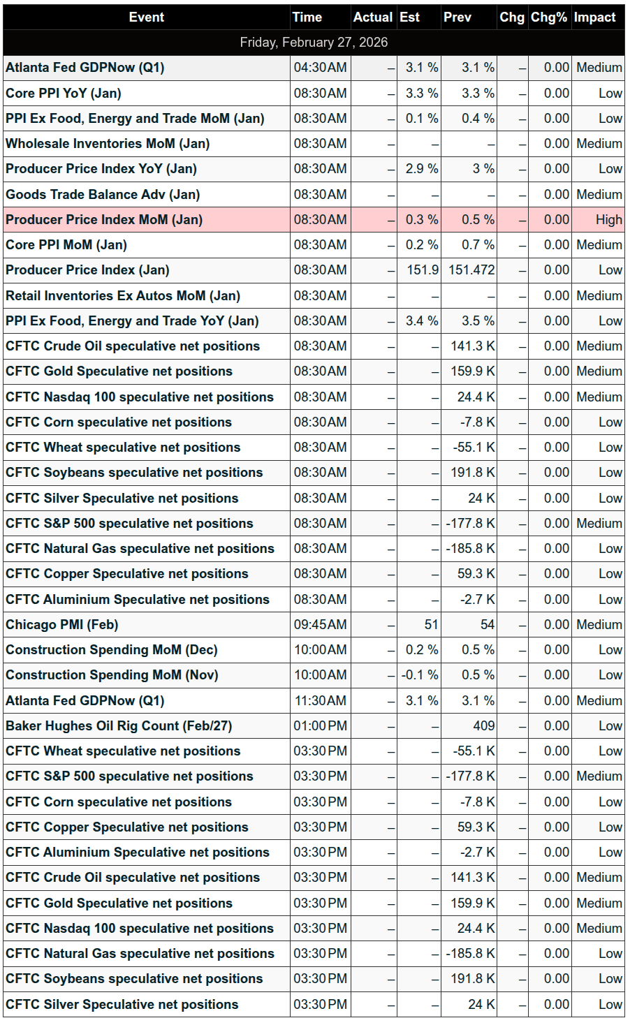 Today could be another banger: PPI at 8:30, Chicago Business Barometer (PMI) at 9:45, and construction spending at 10:00. It’s the last trading day of February, the week 4 options expiration, and the end-of-the-month rebalance.