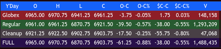 After 4:00 PM, the ES sold off to 6902.75 and settled at 6920.00, down 39.75 points (-0.57%). Other settlements included the NQ at 25081.00 (-1.19%), the YM at 49531 (-0.01%), and the RTY at 2680.60 (+0.48%).