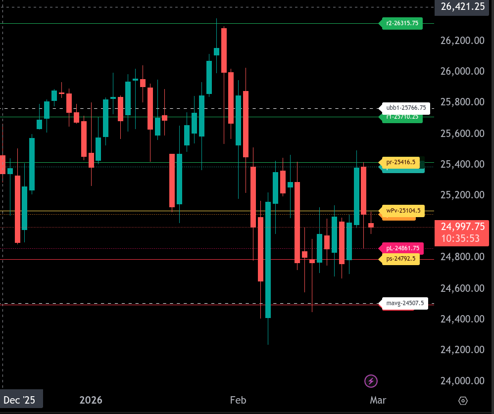 Overall, the market remains bearish below 25104.50. Bulls need a decisive reclaim of that level to regain control, while continued rejection beneath it favors rotation back toward 24861.75 and potentially 24792.50.