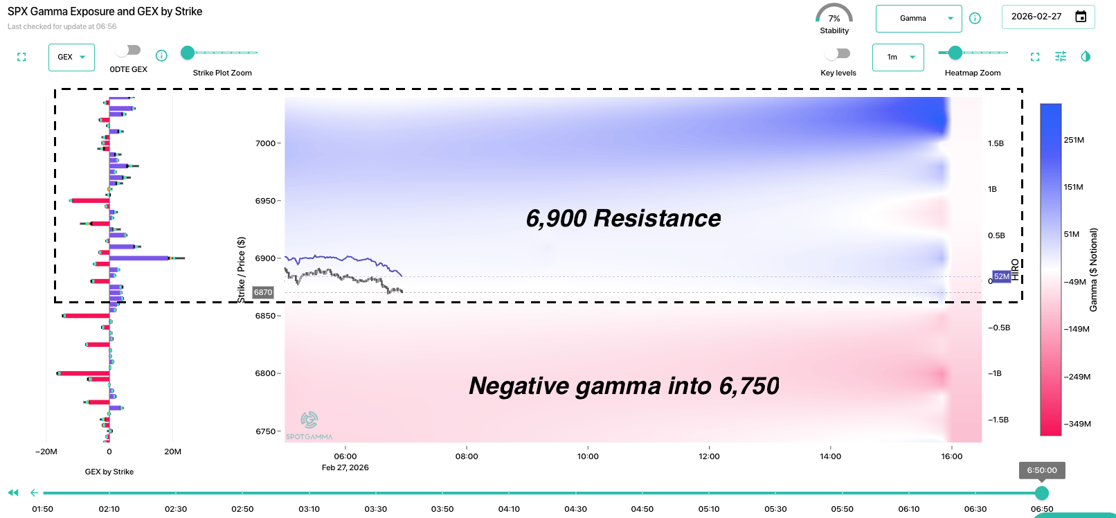 The gamma map for today is unchanged from that of recent weeks: positive gamma resistance >6,900, and negative gamma <6,900 into the 6,700s.
