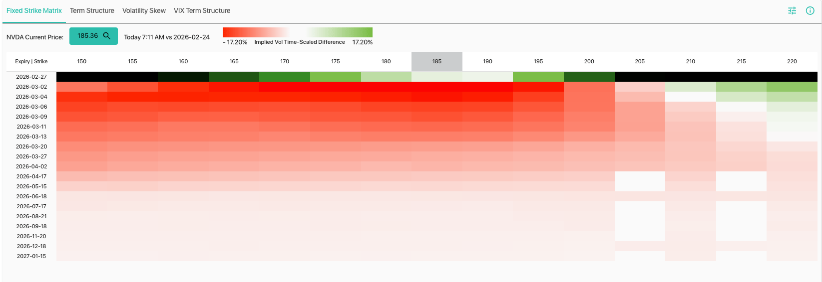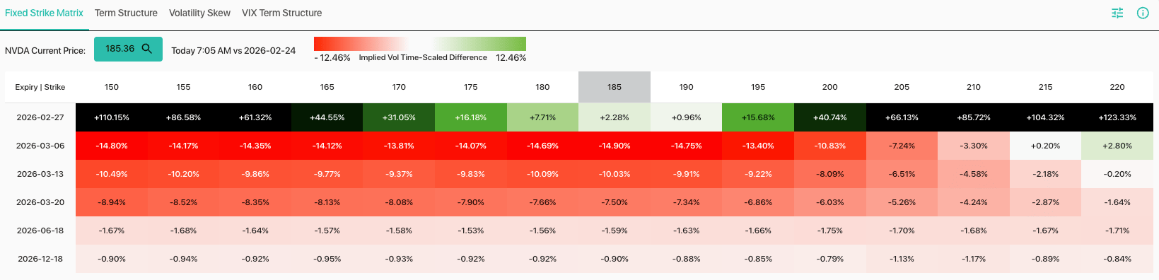 There was a lot of reaction to NVDA’s earnings, as AI and related sentiment seems quite dour. Its an interesting extreme because new and amazing tools are launched each day. On this topic, NVDA saw a very strong post-earnings IV crush despite the fact that the stock was down 15%. Here is the day/day change in fixed strike IV, and as you can see vols dropped 7 – 20 vol points across the next several expirations.