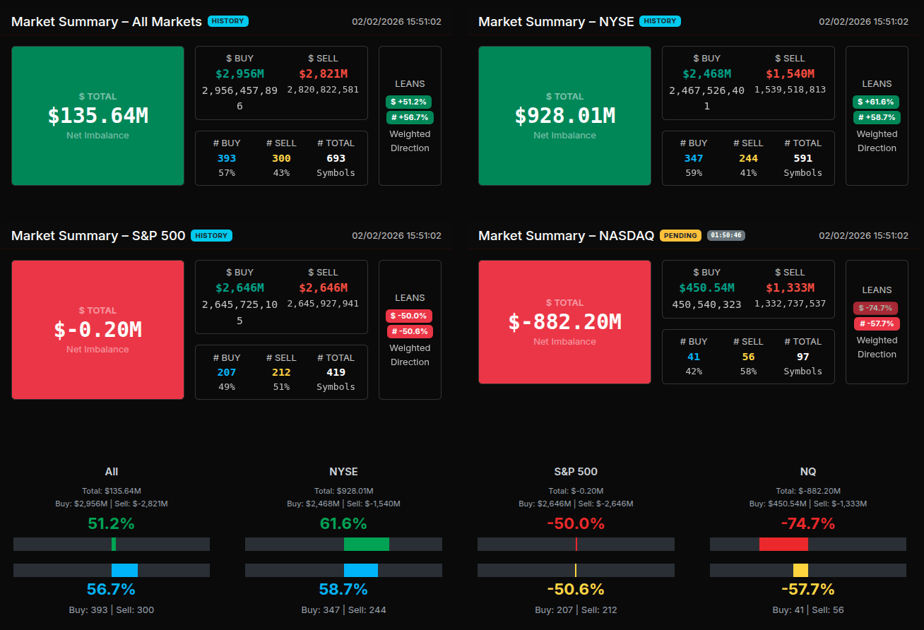 Index-level summaries reinforced this split. NYSE finished with a strong positive imbalance and a +61% buy lean, while NASDAQ closed deeply negative at roughly -75%, an extreme reading that underscored aggressive tech selling. The S&P 500 sat near flat, reflecting internal rotation rather than directional conviction.