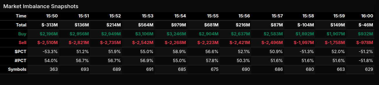 Monday’s Market-on-Close auction opened with a clear buy-side bias that intensified through the 15:53–15:54 window, where total imbalances peaked near $979M. Early snapshots showed heavy gross activity on both sides, but the buy programs consistently outweighed sell pressure until the final minutes. As the clock ticked toward 16:00, imbalances compressed sharply, flipping briefly negative before settling with a modest net buy, a classic late-day offset that signaled execution-driven rebalancing rather than panic liquidation.