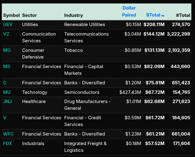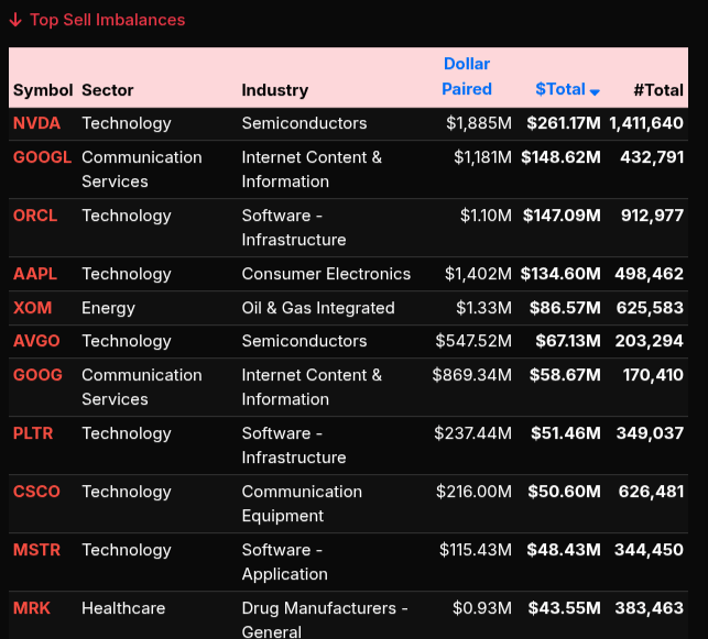 At the symbol level, sell imbalances were dominated by mega-cap technology. NVDA, AAPL, ORCL, AVGO, and PLTR all appeared prominently, confirming that the Technology sector sell skew was driven by size and concentration, not breadth. Communication Services added to the downside via GOOGL and GOOG, while XOM anchored Energy selling. On the buy side, Utilities and Financials led, with GEV, VZ, MS, C, and WFC absorbing steady demand, indicative of portfolio reweighting into yield and balance-sheet strength.