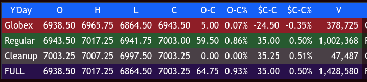 It then caught a slight bid to trade at 7004.00 as the 3:50 PM cash imbalance initially showed ‘small to buy’ before flipping to $950 million to buy. It eventually traded at 7000.00 on the 4:00 PM cash close. After 4:00 PM, the ES traded back up to 7007.50, flatlined, and settled at 7002.50. This represented an increase of 36.75 points (+0.53%) and a 153-point recovery from the Globex low.