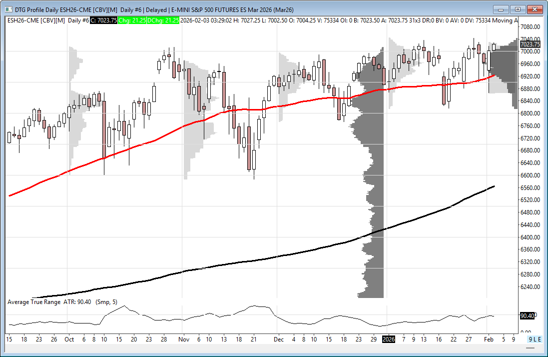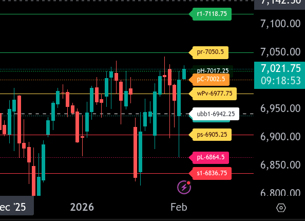 Overall, price is slightly constructive while above 6977.75, but the broader context remains two-sided. Expect responsive trade around the bull/bear line and range-bound conditions unless price decisively accepts above 7050.50 or breaks below 6905.25.