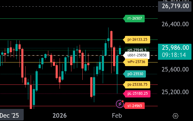 If price fails to hold above 25,736.00, downside pressure likely increases. Initial support is at 25,530.00, followed by 25,338.75, the lower range target. A break below 25,338.75 opens risk toward 25,180.25, where buyers must respond to avoid a deeper liquidation.