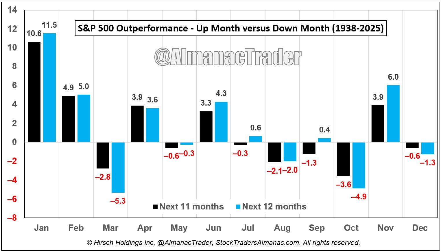 January Barometer rules because no other month exhibits as much outperformance when the month is up versus down on the following 11-months or 12-months return. Since 1938, when the S&P 500 was up in January, the next 11-months average a gain of 11.8%. When January is down, the next 11-months average plummets to just 1.2%. In years with a positive January, the next 11 months have historically outperformed a down January by 10.6%. Over the following 12 months, the outperformance grew to 11.5%. As you can see from the bar chart, no other month comes close to this outperformance gap.