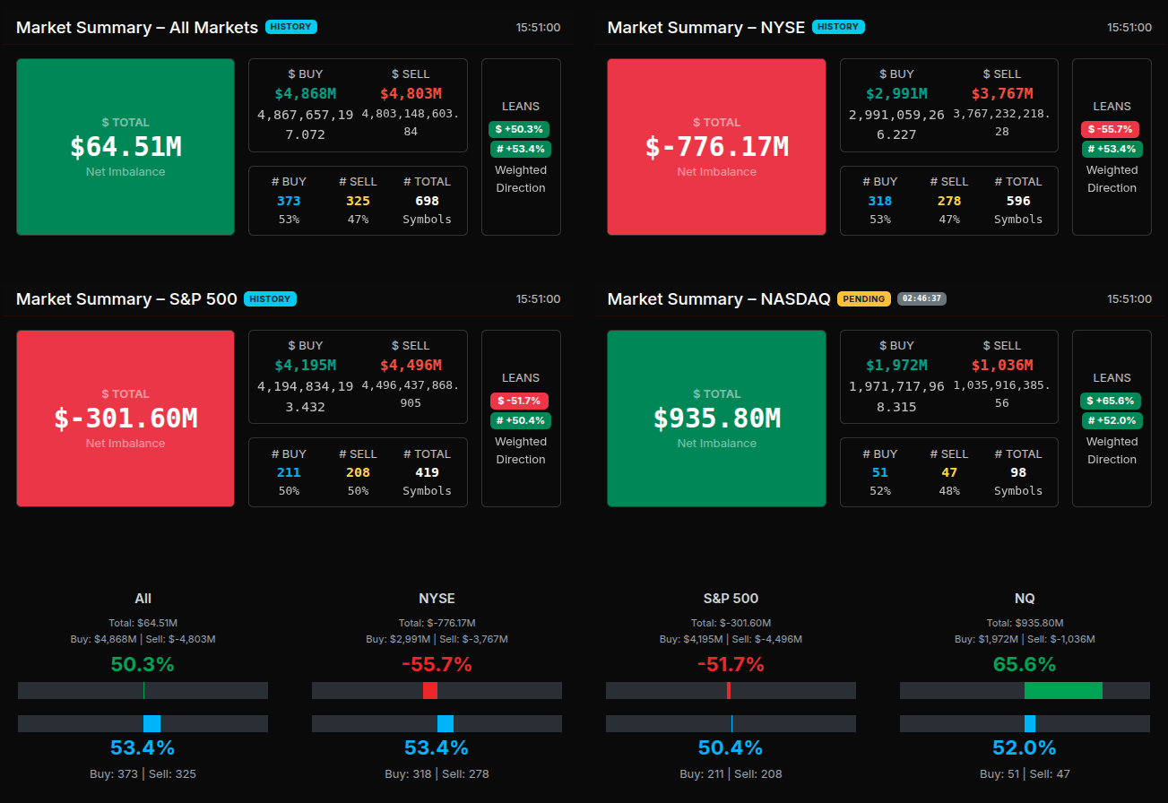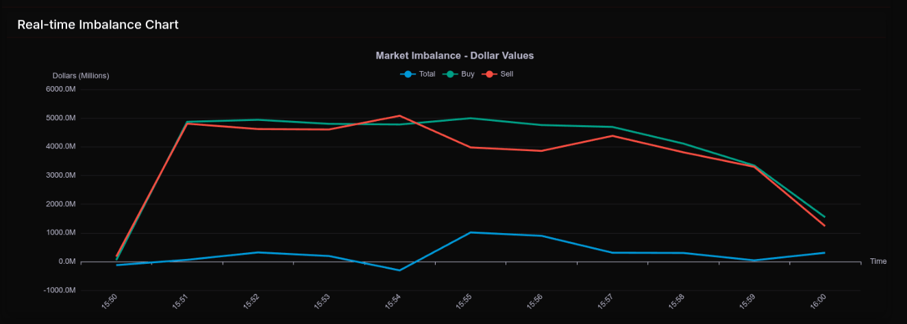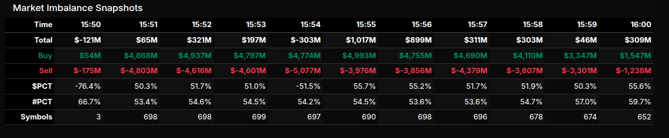 The first sign of expansion came at 15:55 when the total jumped to $1.017B buy, driven mainly by a brief pullback in sell interest to $3.976B. But the shift didn’t last. By 15:56 the imbalance slipped back to $899M, and from 15:57–15:59 the auction reverted into narrow, rotational readings between $303M and $46M, with buy and sell flows once again tightly paired. Into the bell, the imbalance lifted slightly to $309M, a mild uptick but not a trend.
