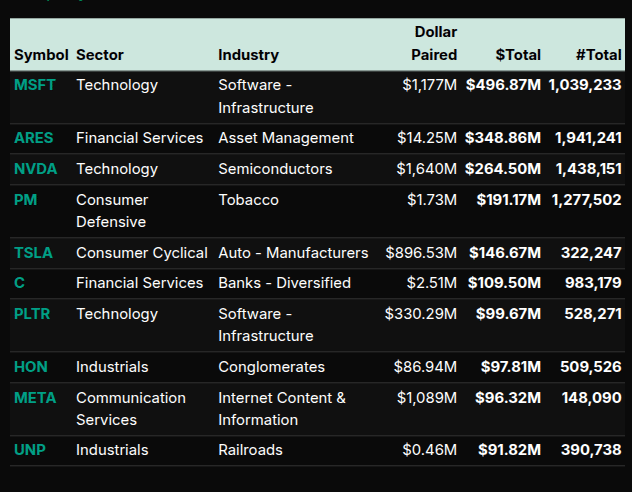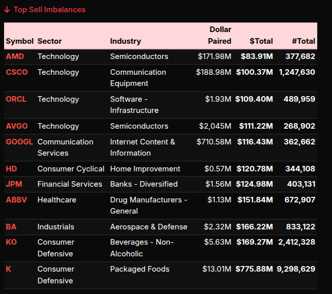On the individual names, the sell tape was dominated by AMD, CSCO, ORCL, AVGO, GOOGL, HD, JPM, ABBV, BA, KO, and K—a broad mix spanning tech, financials, healthcare, and staples. Buy interest concentrated in MSFT, ARES, NVDA, PM, TSLA, C, PLTR, HON, META, and UNP, giving Technology, Industrials, and Financials the strongest backbone into the close.