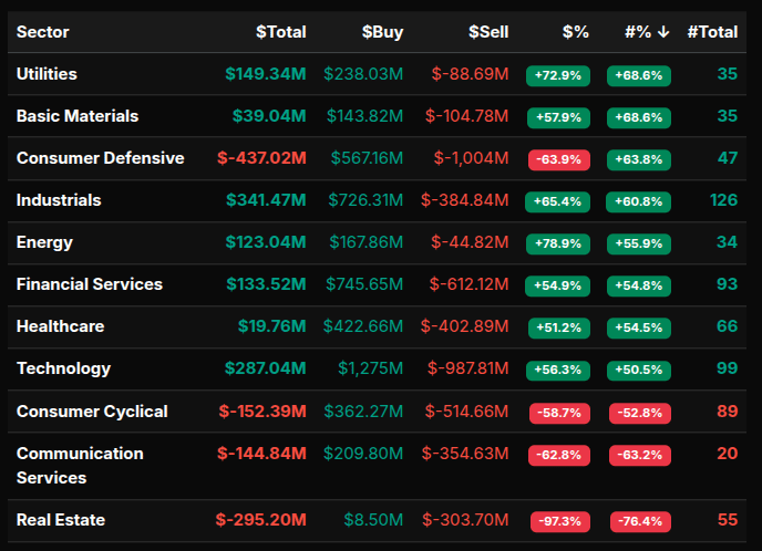 Sector flows paint the real story. Utilities (+72.9%), Industrials (+65.4%), Energy (+78.9%), and Technology (+56.3%) showed notable buy leans, each above the 66% threshold at points—indicating pockets of wholesale buying. Meanwhile, Consumer Defensive (-63.9%), Consumer Cyclical (-58.7%), and Communication Services (-62.8%) were sold aggressively. Real Estate posted the heaviest skew at -97.3%, a clear liquidation signal.