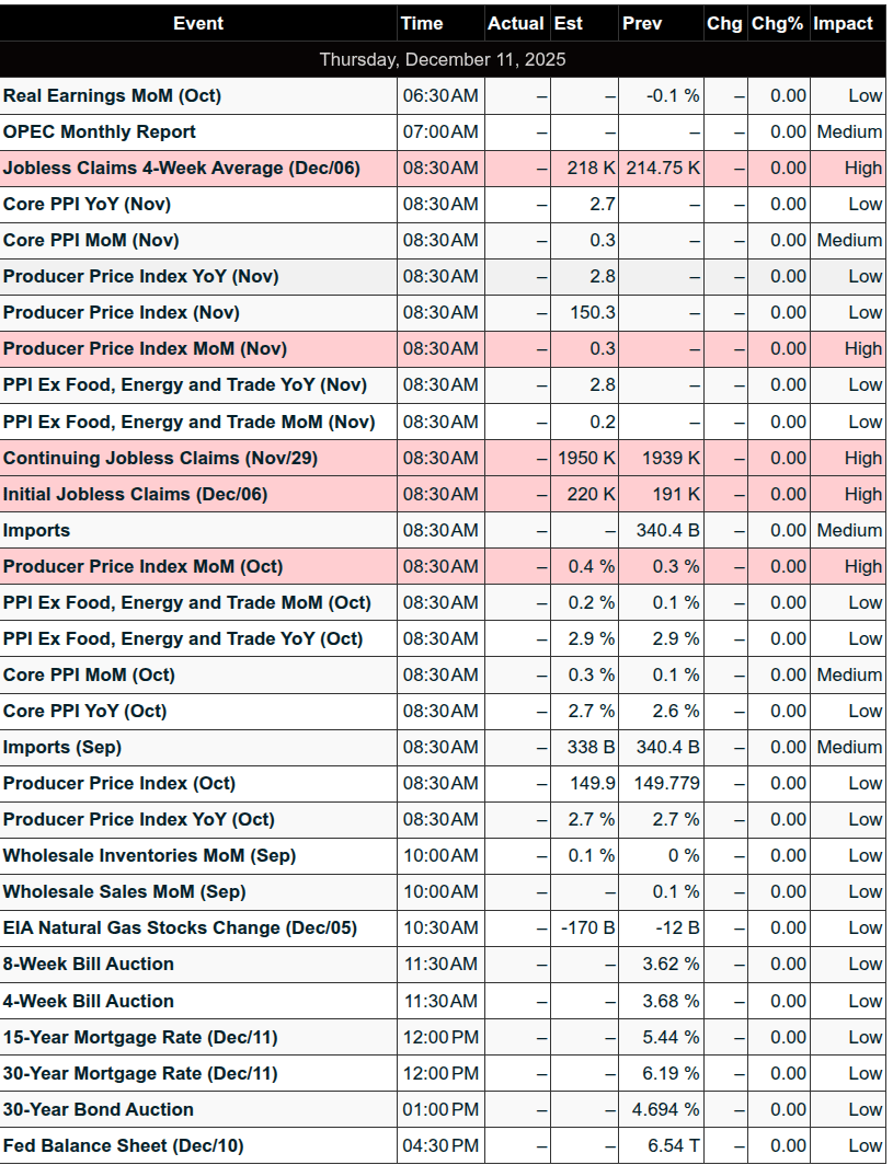 We have a full spread of economic reports today: the Producer Price Index (PPI) for November at 8:30 AM ET; weekly Initial Jobless Claims at 8:30 AM ET; U.S. International Trade data for September at 8:30 AM ET; the Quarterly Services Survey at 10:00 AM ET; State Employment and Unemployment data for September at 10:00 AM ET; and the Wholesale Inventories report at 10:00 AM ET.
