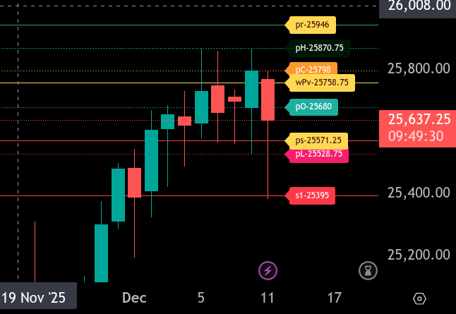 Overall, the bias remains soft below 25,758.75. Reclaiming the bull/bear line would shift momentum toward the upper range target, while continued rejection keeps pressure on the lower support zones.