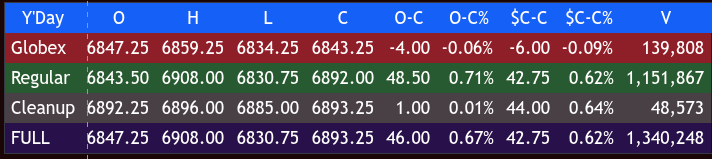 The ES made seven higher highs all the way up to 6908.00 at 3:30, pulled back to 6900.25 at 3:40, and traded 6900.75 as the 3:50 imbalance showed $500 million to sell and $2.2 billion to buy on the NASDAQ. It sold off down to 6889.75 at 3:59 and traded 6892.00 on the 4:00 cash close. After 4:00, the ES sold off to 6885.00, rallied to 6896.00 at 4:45, and settled at 6893.25, up 46.00 points or +0.67%. The NQ settled at 25,798.00, up 98.25 points or +0.38%.