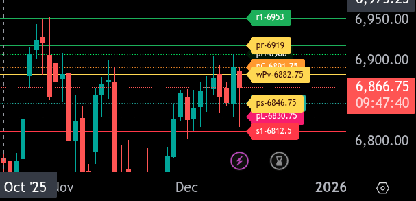 The upper range target sits at 6,919. If buyers reclaim the bull/bear line, the path opens toward resistance at 6,891.75 and then 6,908 before the upper range target at 6,919.