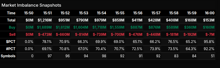 The 3:50 p.m. MOC/MiM data revealed a strong $1.216B buy imbalance dominated by Nasdaq stocks, with 78.1% of NQ symbols and 69.1% of total names showing buy pressure. S&P 500 names were also net to buy at 56.3%, while NYSE names were mixed. The imbalance held above the +66% threshold for a strong buy signal and helped stabilize prices into the bell.