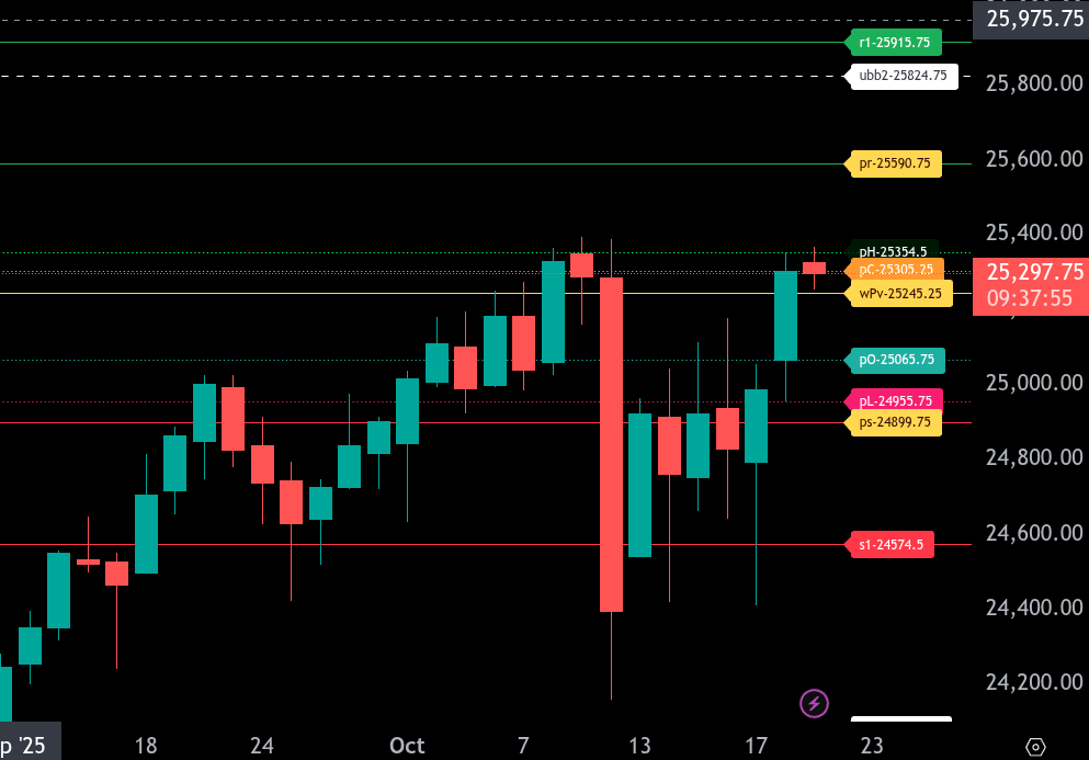 Overall, the market bias remains constructive above 25,245.25, but traders should monitor reactions around that pivot closely for confirmation. Bulls need to hold that zone to maintain control; otherwise, expect a rotation back toward 24,900.