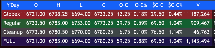 Post-close, the cleanup session was quiet but continued to reflect underlying buy strength, printing a high of 6780.50 and settling at 6780.25. The full-session range ran from 6694.00 to 6783.00, with total volume of 1.14M contracts, of which 909K traded during the cash session. The full-session close at 6780.25 marked a 59.25-point or 0.88% gain from the open and a 69.50-point or 1.04% increase versus the previous cash close.