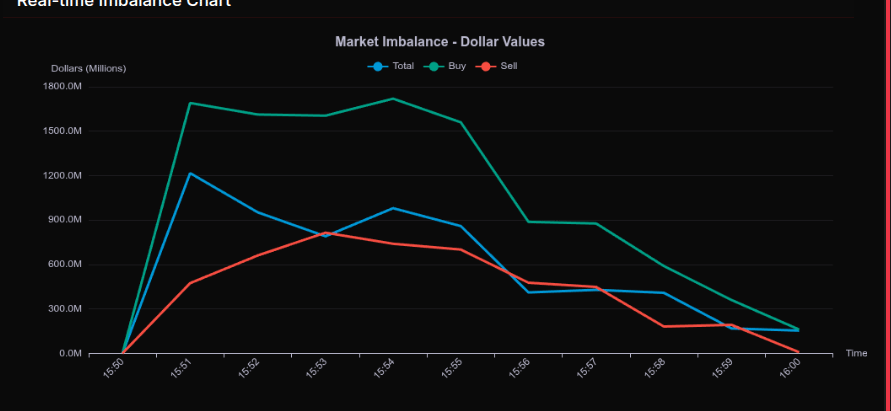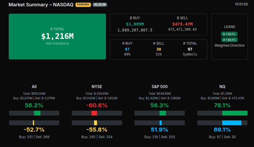 The 3:50 p.m. MOC/MiM data revealed a strong $1.216B buy imbalance dominated by Nasdaq stocks, with 78.1% of NQ symbols and 69.1% of total names showing buy pressure. S&P 500 names were also net to buy at 56.3%, while NYSE names were mixed. The imbalance held above the +66% threshold for a strong buy signal and helped stabilize prices into the bell.