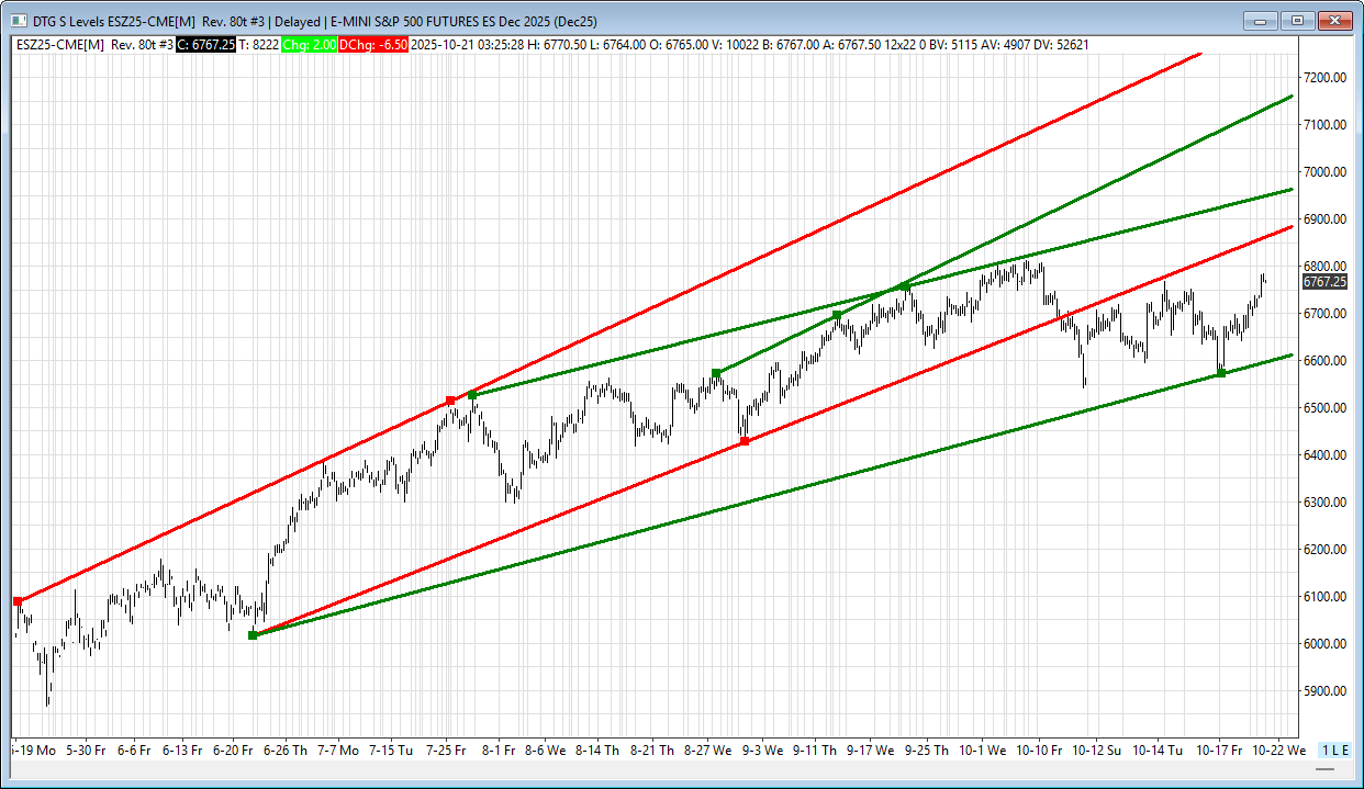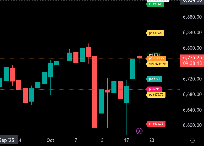 Currently, ES is trading around 6774.75, just above the bull/bear line. If buyers can hold the tape above 6759.75, the next upside target is 6839.50, which serves as today’s upper range target. A move through that level opens the door toward 6914.50.