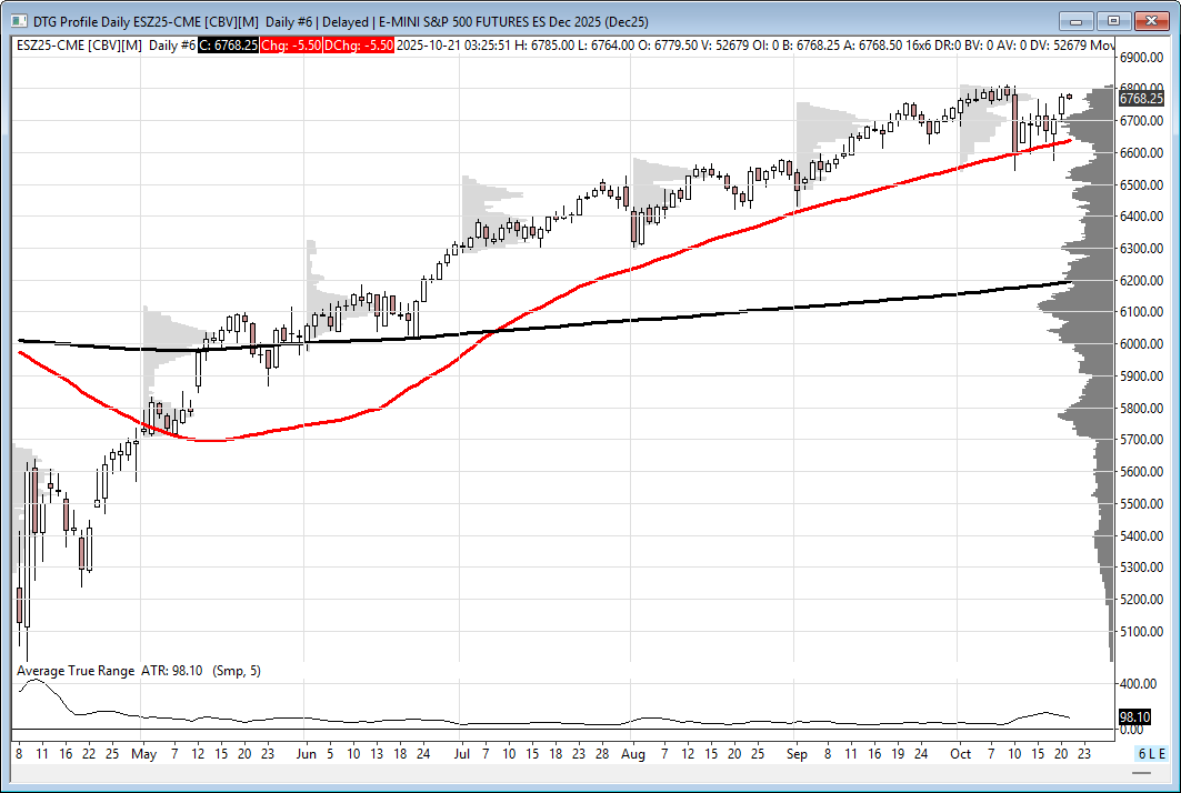Overall sentiment was bullish, driven by firm breadth and sustained buy imbalances. The ES closed near session highs, setting a constructive tone for Tuesday as the index continues to hold above its 50-day average near 6638. Immediate support remains around 6700–6710, while resistance sits near 6780–6785, just below last week’s upper range.