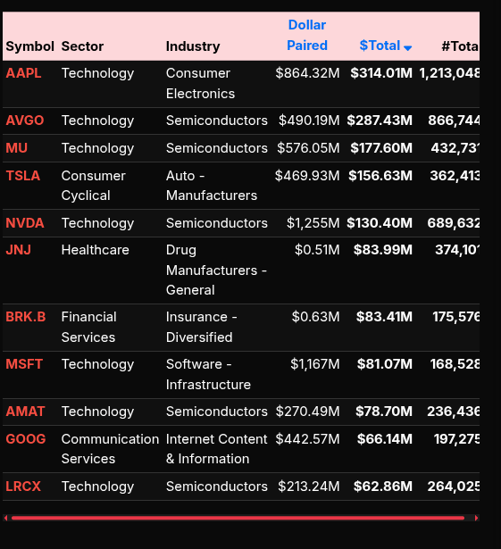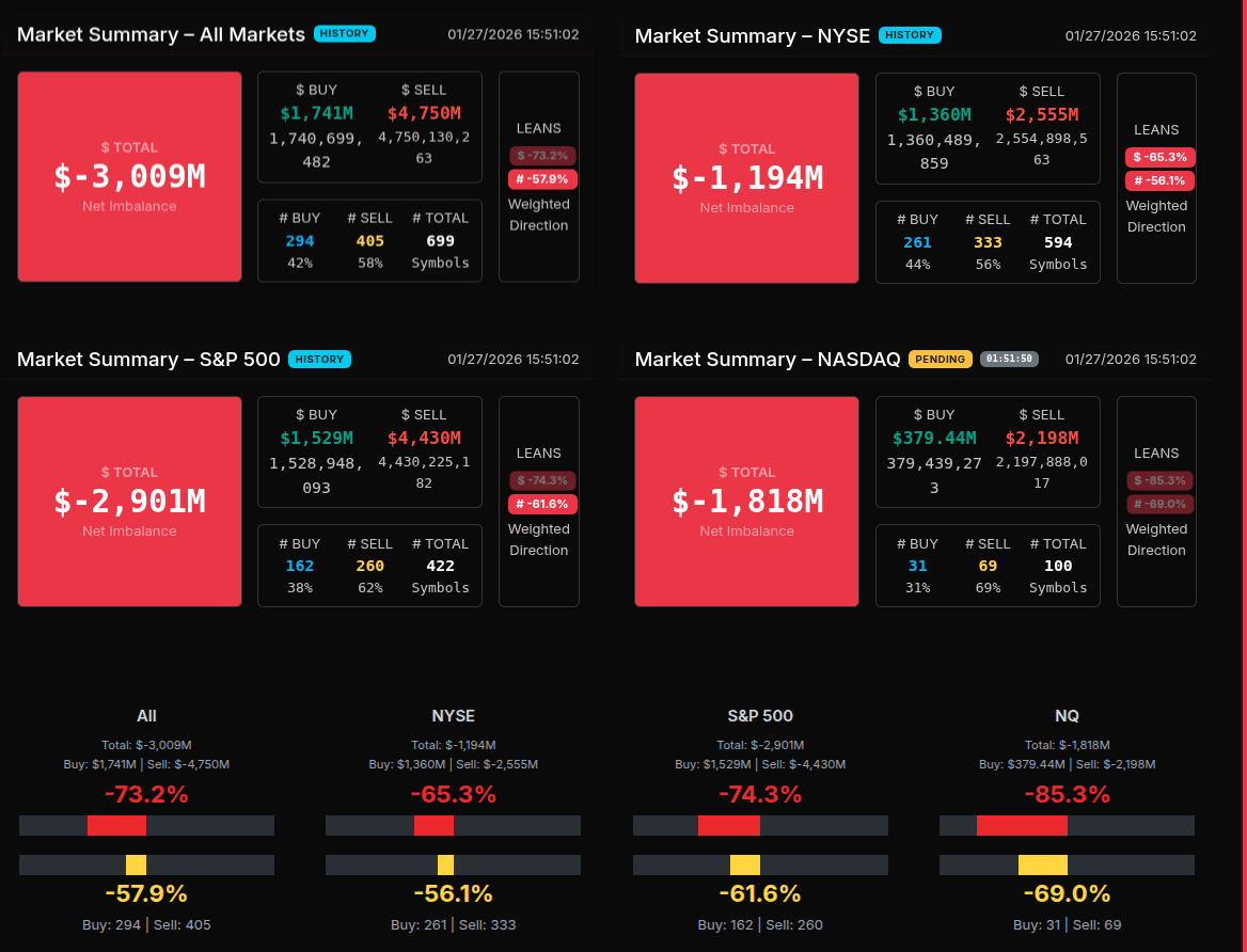 Sector behavior made the tone clear. Technology was the dominant source of supply, posting a net imbalance near –$1.44B with a lean well beyond –66%, marking a wholesale liquidation rather than rotation. Consumer Cyclical, Financial Services, Industrials, Communication Services, and Healthcare all registered sell leans between –67% and –89%, confirming broad institutional distribution. These were not subtle reallocations — they were programmatic sells across growth, cyclicals, and defensives alike.