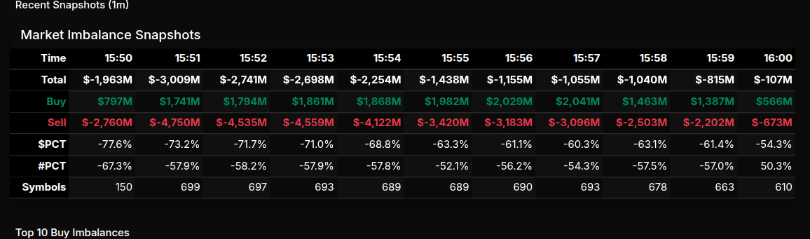 The Market-on-Close auction opened with a heavy sell imbalance and remained decisively one-sided through most of the window. Early snapshots showed total imbalances near –$3.0B, driven by persistent sell programs that peaked just after 15:51, when sell volume surged above $4.7B while buy interest struggled to keep pace. From that point forward, the imbalance steadily moderated, but the market never meaningfully flipped, finishing with residual sell pressure into the close.