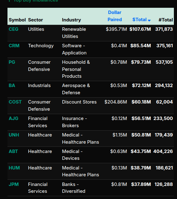 At the single-stock level, sell pressure was concentrated in mega-cap technology and high-beta leaders. AAPL, NVDA, MSFT, AVGO, MU, and TSLA all appeared among the largest dollar-weighted sell imbalances, reinforcing the broader Technology sector unwind. On the buy side, Utilities and Defensive names dominated, including CEG, PG, COST, and select Healthcare and Financial stocks, consistent with late-day risk reduction rather than dip-buying.